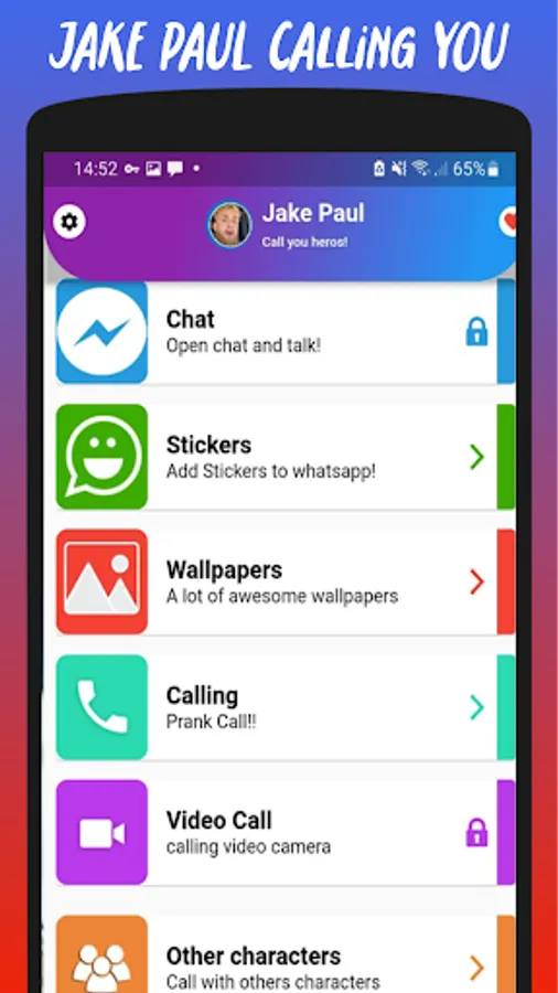 Get ready to have a whole lot of fun with your favorite YouTube star, Jake Paul! With JAKE PAUL PRANK, you can now video call and chat with him, as well as share funny stickers with your friends. Show off your loyalty to Jake Paul and take advantage of this unique opportunity to connect with him in a whole new way. Don't miss out on all the laughs and good times that await you with JAKE PAUL PRANK!
