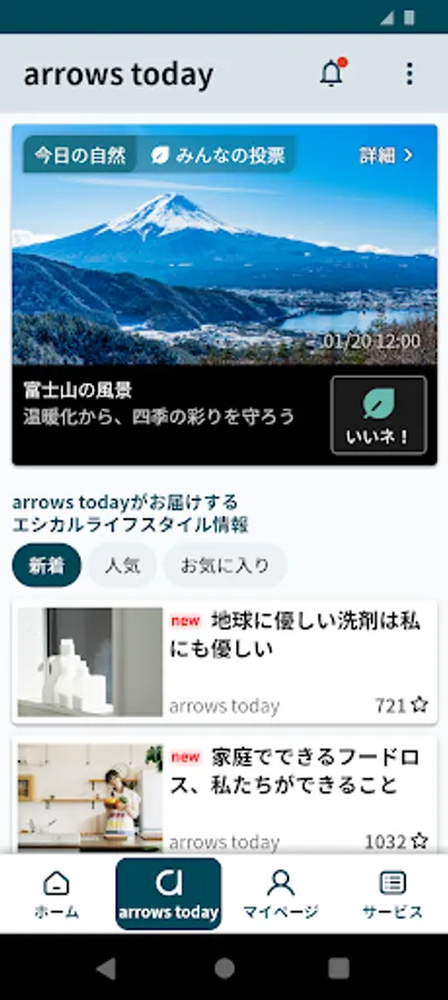 arrows today is a content that gives you a step forward perspective and updates your life. "Today's Nature", where you can see the natural scenery of various parts of Japan, and the latest articles will propose an ethical lifestyle.