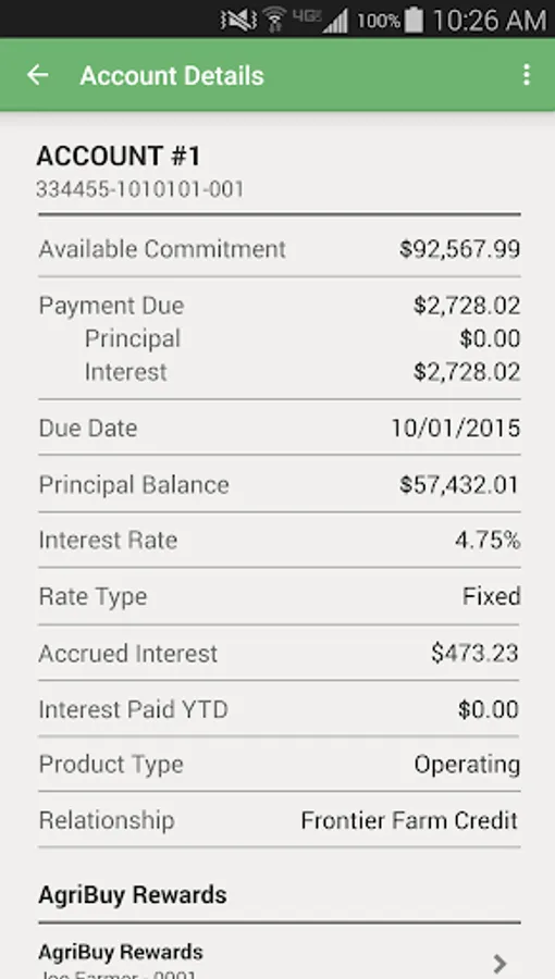 Account Details include principal balance, available commitment, interest rate and type, and next payment amount and due date.