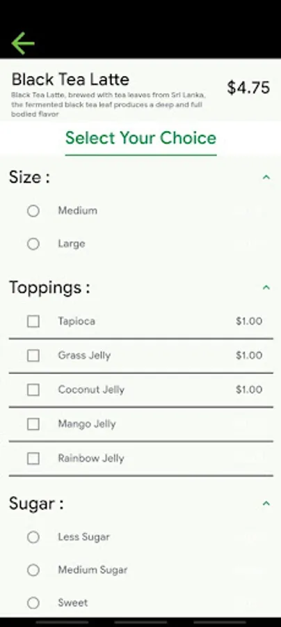 - Topping selection: regular/light/double