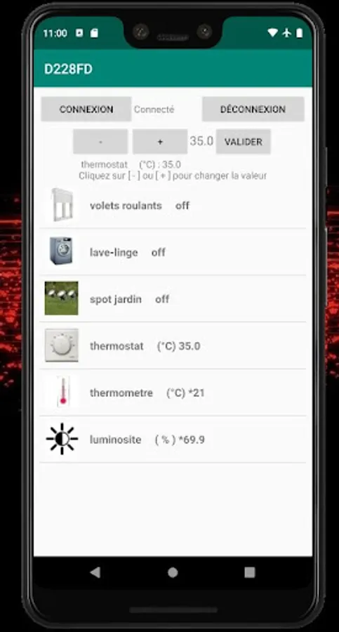 It is necessary to press on "CONNECTION" to read in real time the temperature and the luminosity.