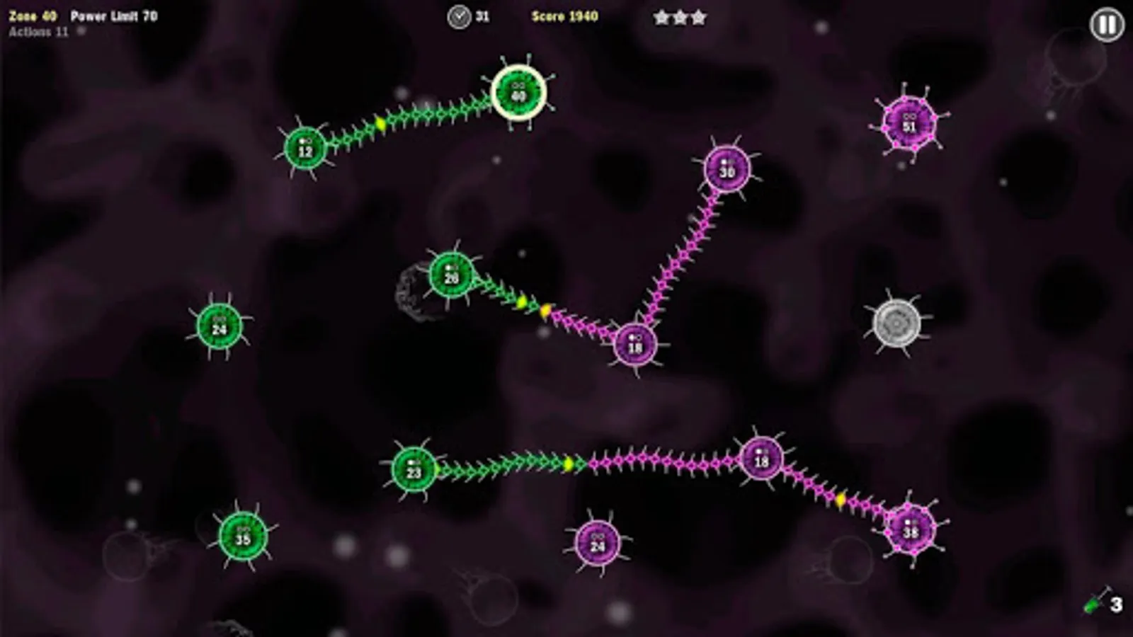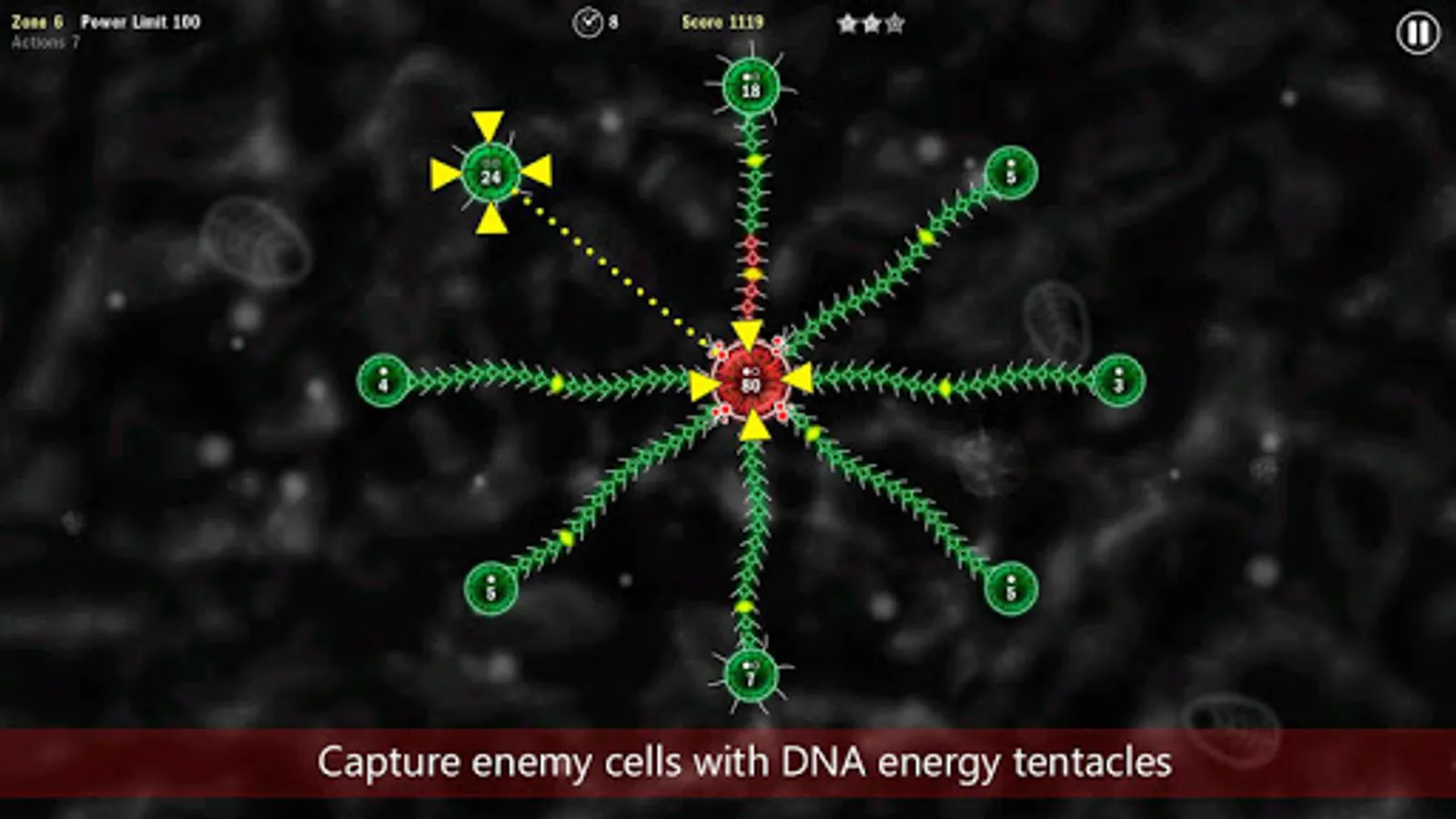 You can cure the organism by capturing enemy cells. To do this, draw a line between green antibody and red enemy cells. This will launch DNA tentacles which drain energy from enemy cell cores and eventually overtake them. Keep an eye on your energy supply and boost your attacks by cutting the tentacles. Capture all enemy cells to secure a zone. Cure all zones and the life form will survive…