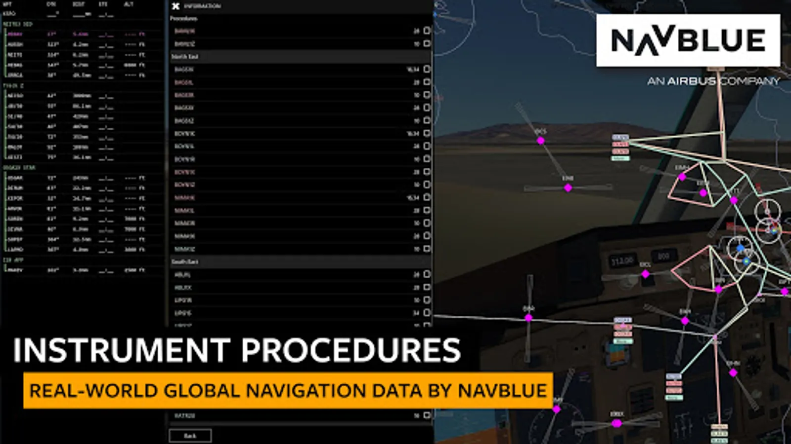 • Real-world navigation data including airspaces, NAVAIDs, SIDs, STARs, and approaches, furnished by NavBlue (an Airbus Company)