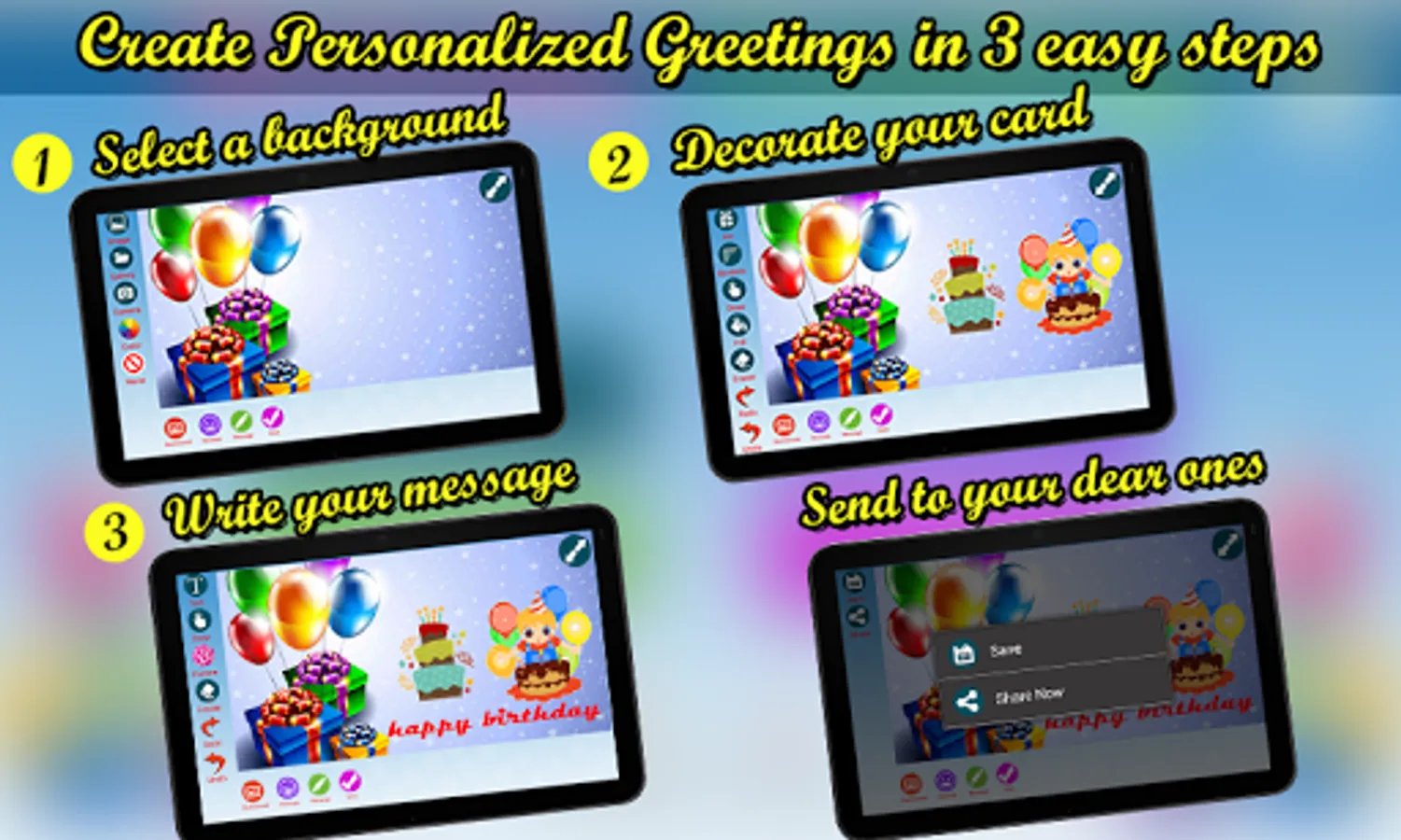 Create and Send Birthday Greeting eCards in 3 easy steps, choose Background, Decorate your card, add your Text and send or save
