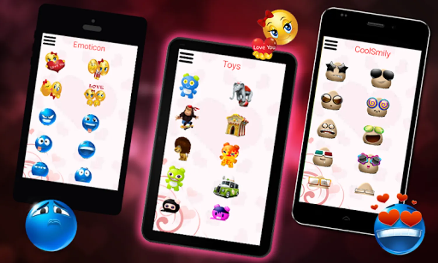 More than 250+ emoji are present for users, you can use these emoji with your standard messaging app like, Whatsapp, Facebook, Messenger, Google Hangouts, LINE, We Chat, Skype, imo, quicker, Viber, GO SMS, KakaoTalk, textPlus, BBM, Cubie, Chomp SMS, gtalk ,Twitter and more. Tap on any smiley, Choose an app in the pop-up and tap any contact into your Contacts app, and you'll see the smiley there!