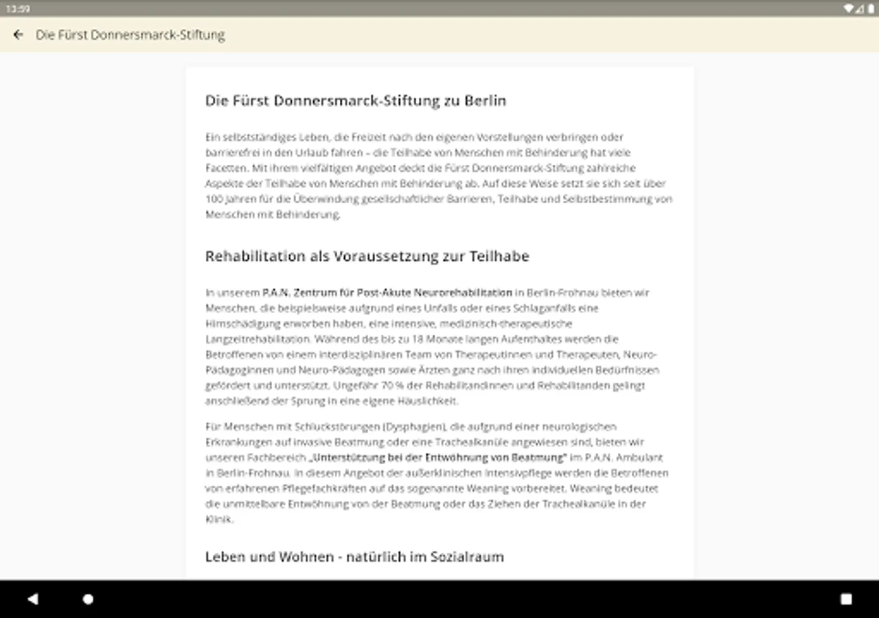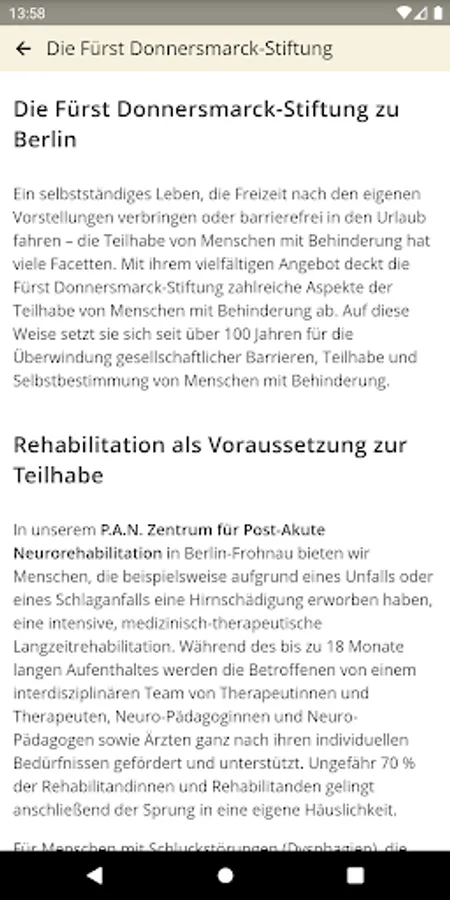 The Fürst Donnersmarck Foundation is a Berlin foundation for people with disabilities. It runs the ultra-modern P.A.N. in Berlin-Frohnau. Center for Post-Acute Neurorehabilitation and in Berlin-Zehlendorf the Villa Donnersmarck as an inclusive meeting point for people with and without disabilities. Distributed throughout Berlin, it offers numerous outpatient housing options for people with disabilities. Last but not least, with the Seehotel Rheinsberg and the Heidehotel Bad Bevensen, two completely barrier-free hotels belong to the foundation. The Fürst Donnersmarck Foundation sees itself as a partner and driver in the process of more inclusion and self-determination for people with disabilities.