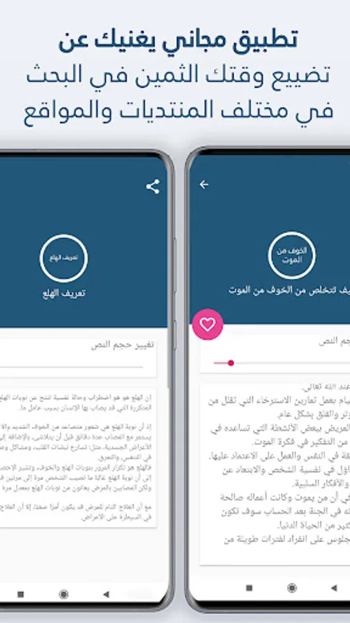 We offer you this free application that keeps you from wasting your precious time searching in various forums and sites, most of which are without result, so we specially made an application for you that helps you identify addiction causes, diagnosis and symptoms as well as treatments, whether with the Holy Qur’an, medicines or without them and how to prevent From fear and tension and the resulting mental and physical diseases from negative thoughts, diseases and others, and how to maintain your mental health and how to eliminate, control and manage fear and stress.