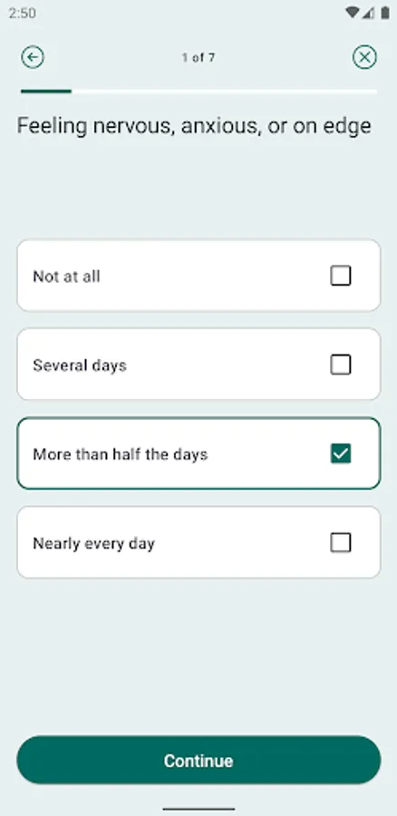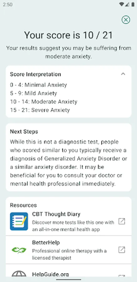 DISCLAIMER: This self-test is not meant to be a diagnosis for your anxiety. Please consult your physician if you are concerned about your symptoms. This app should not be used as a replacement for professional treatment or guidance.