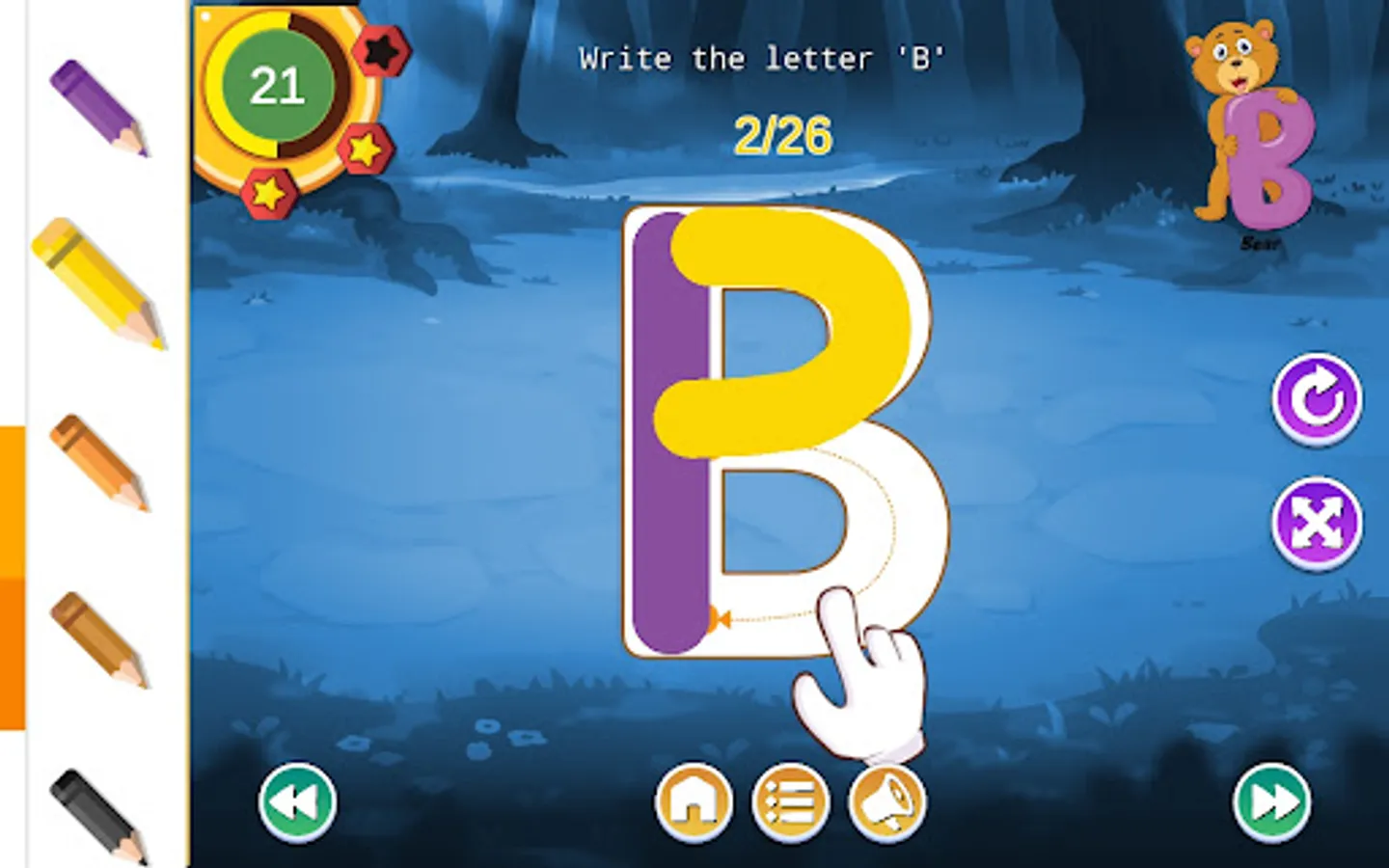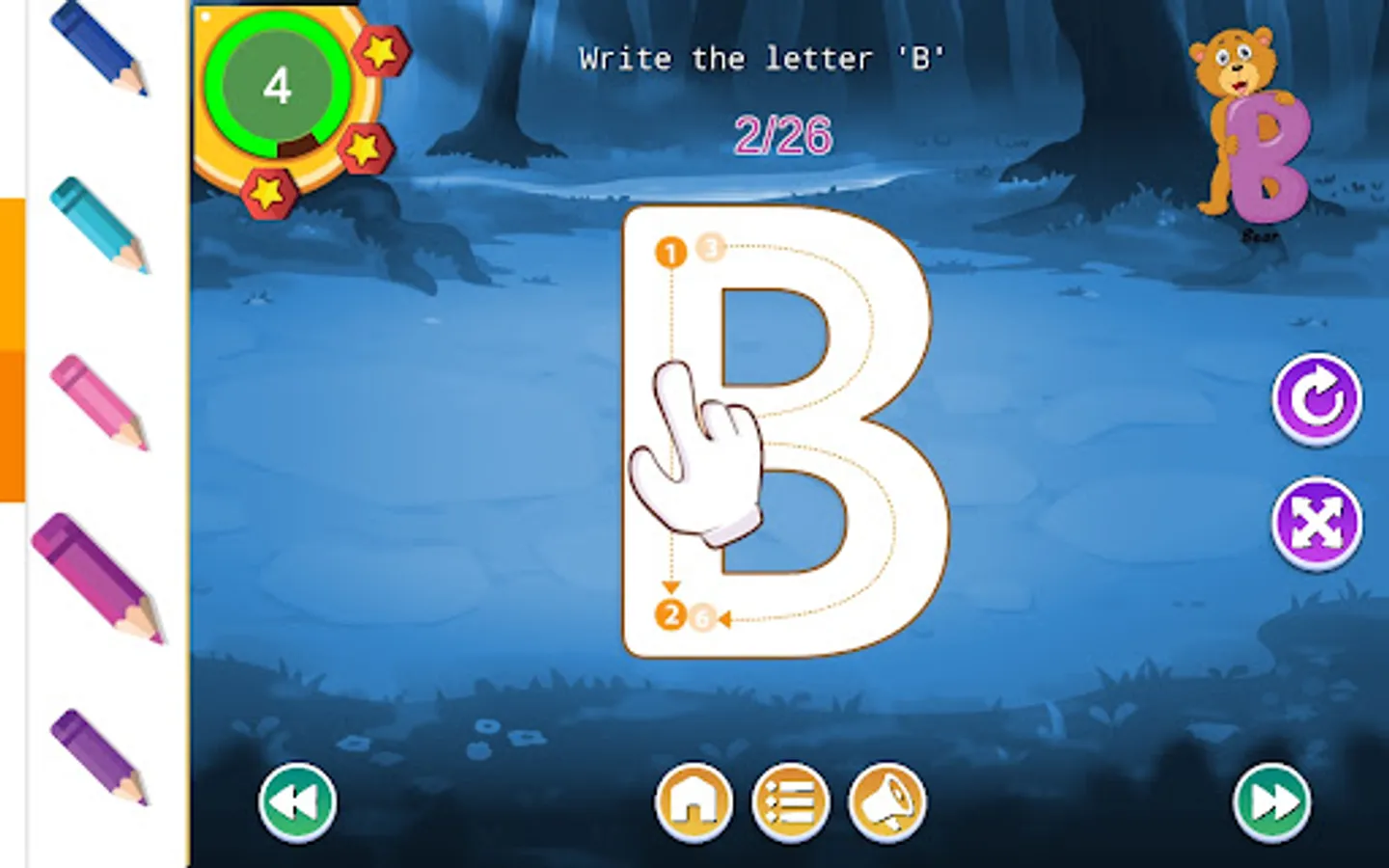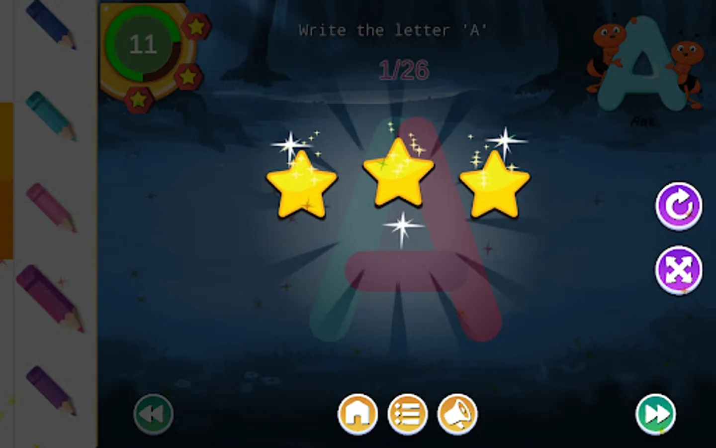 There is a star system to reward and all sections can be reset and repeated as often as you want - with everything saved for the next time the app is used.