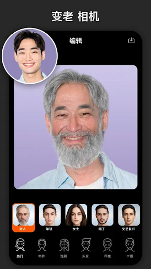 FaceLab offers amazing photo filters to age you! The selfie editor aging filter will transform you into a cute old man or an older woman in just a few seconds. First, choose a beautiful photo from your gallery or take a selfie with the FaceLab Selfie Camera. Find out how you will grow in the future. The magical facial aging effect is like a fortune teller and provides the perfect facial aging prediction. It's so funny to see myself with a beard and gray hair and wrinkles. Glamorous beard filters will completely change your style.