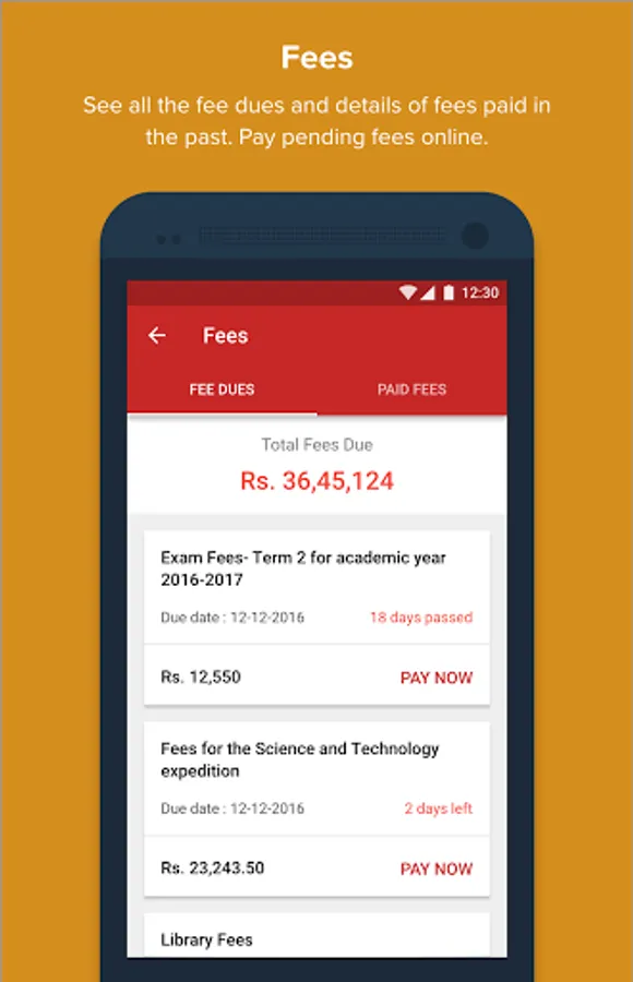 Fees : No more long queues. Now you can pay your school fees instantly on your mobile. All the upcoming fee dues will be listed in the events and you will be reminded with push notifications when the due date is getting closer.