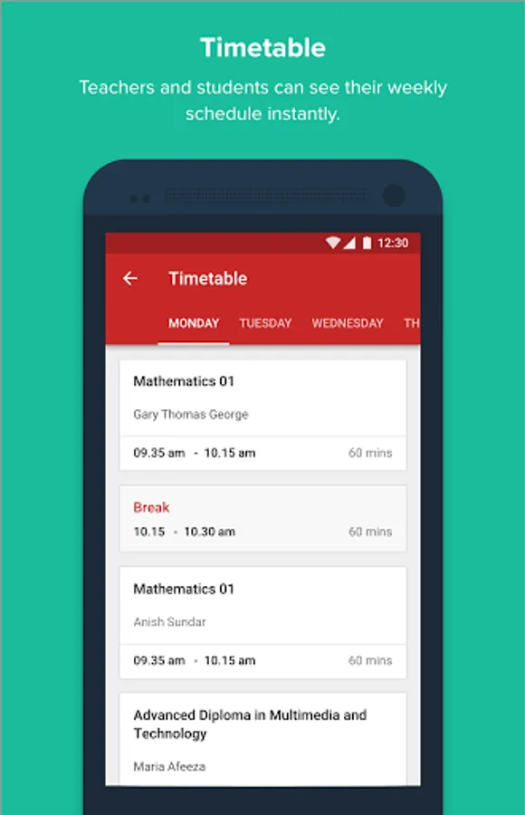 Teacher Timetable : No more shuffling your notebook to find your next class. This app will show your upcoming class in the dashboard. This weekly timetable will help you plan your day effectively.