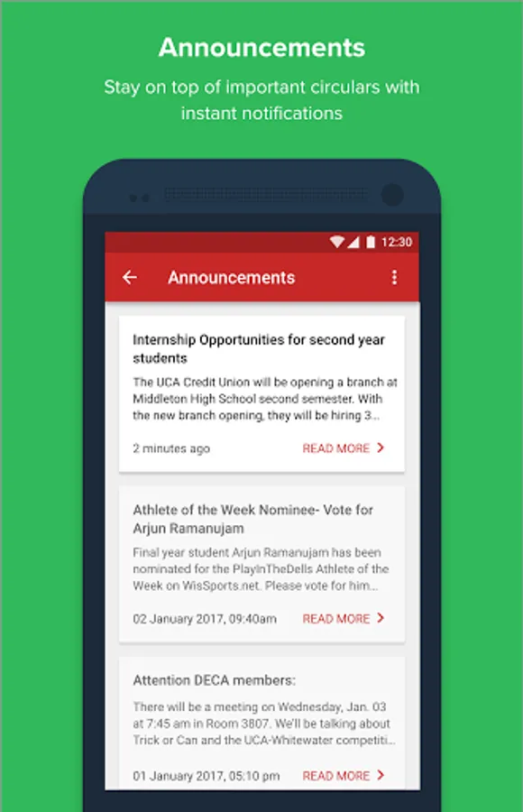 Announcements: The School management can reach out to parents, teachers and students all at once about important circulars. All users will receive notifications for these announcements. Announcements can contain attachments like images, PDF, etc.,