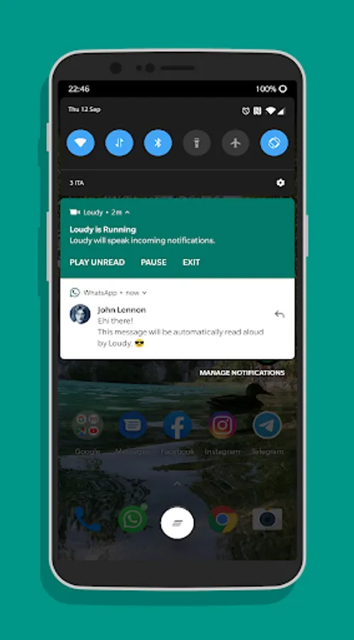 No problems! Loudy will check for all incoming notifications and speak them up to you.