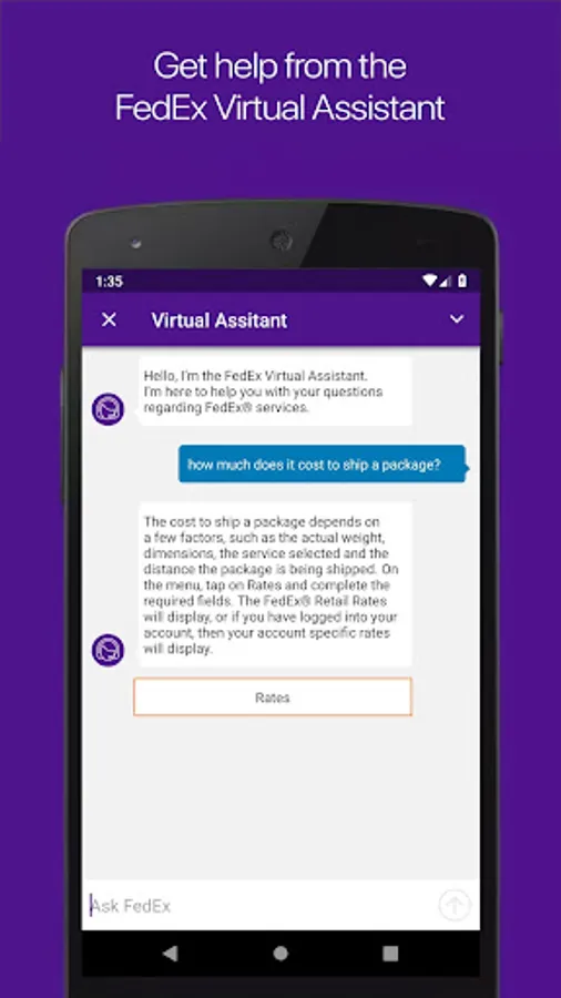 • Access a chat assistant for FedEx Mobile app and services questions