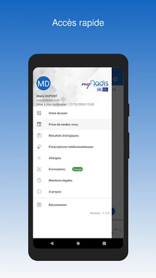 In direct contact with your hospital center, your MyNadis application allows you to quickly access your latest biological results, answer questionnaires and edit your personal information at any time.