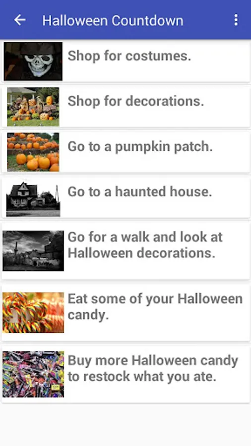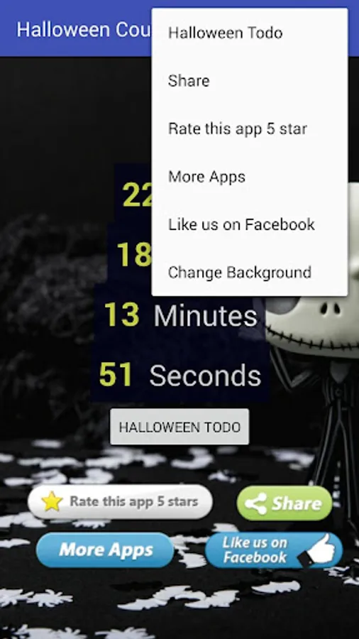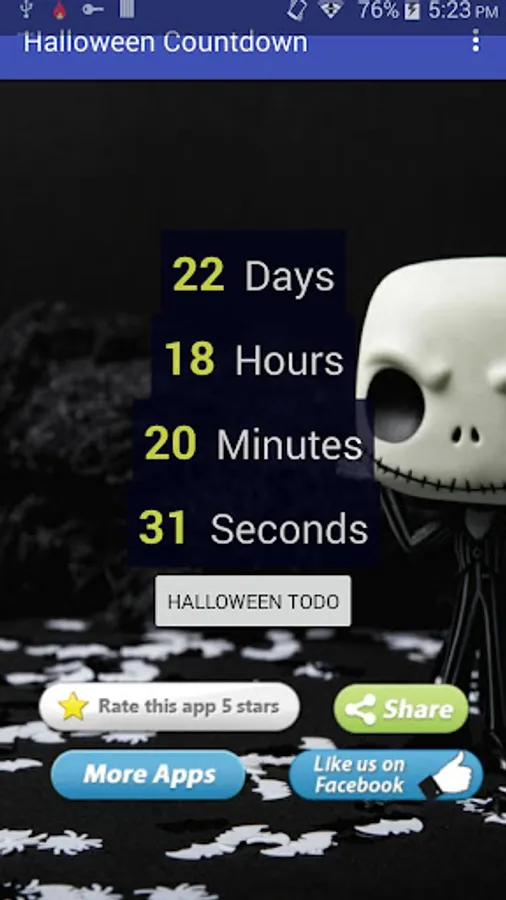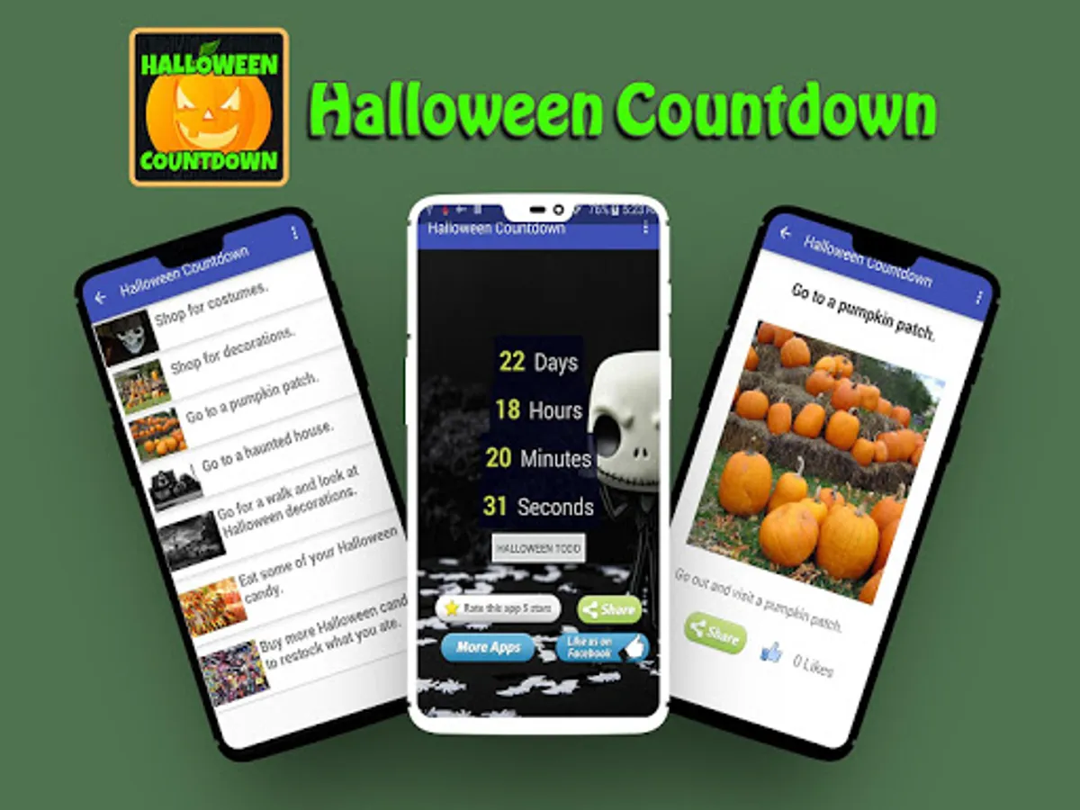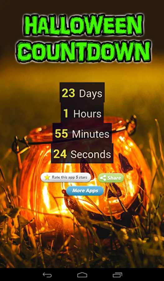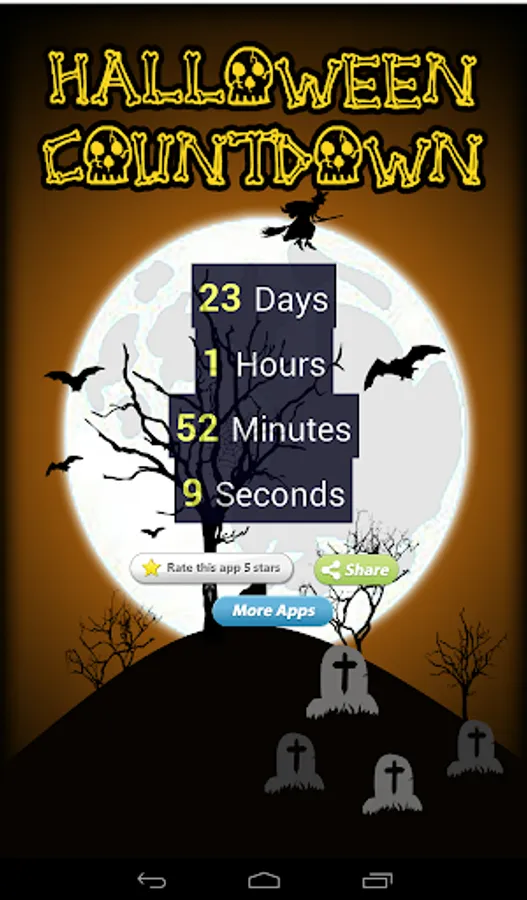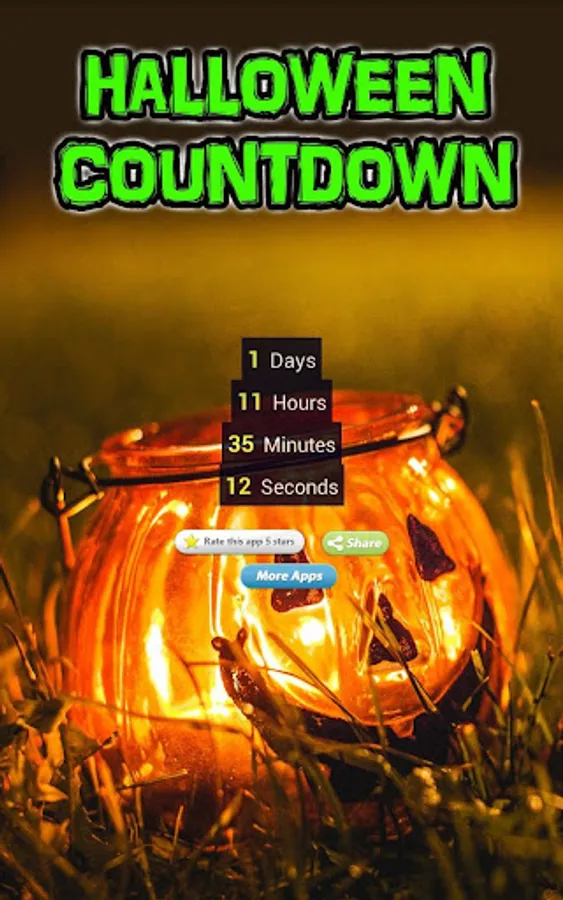 Halloween Countdown App counts down to November 1, 2017. It shows the remaining number of days, minutes, and seconds. Come and celebrate the upcoming Halloween event with us!
