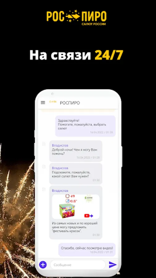 Support service in touch 24/7. They will help you to solve any question: how to set fire to fireworks correctly, what to do in emergency situations, how to choose the right place to launch fireworks and what are the legal requirements.