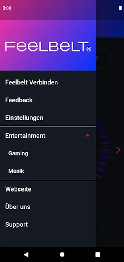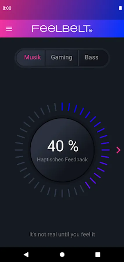 Easily connected with your physical Feelbelt, this app lets you control the intensity of the haptic feedback and the volume of the audio content. The user interface is convenient and self-explanatory – for your full focus on your game, music, film or whatever you love to use the Feelbelt for!
