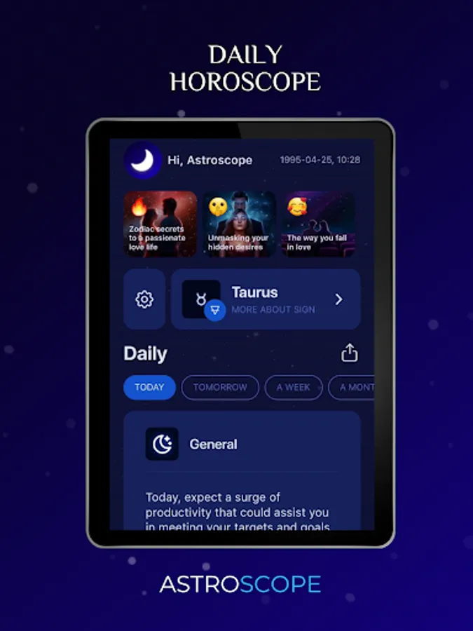 Astroscope offers you accurate and personalized horoscopes assembled by cutting-edge AI for every aspect of your life and every zodiac sign - Aries, Taurus, Gemini, Cancer, Leo, Virgo, Libra, Scorpio, Sagittarius, Capricorn, Aquarius, and Pisces. Stay ahead of your day, week, month, or year with our insightful predictions.