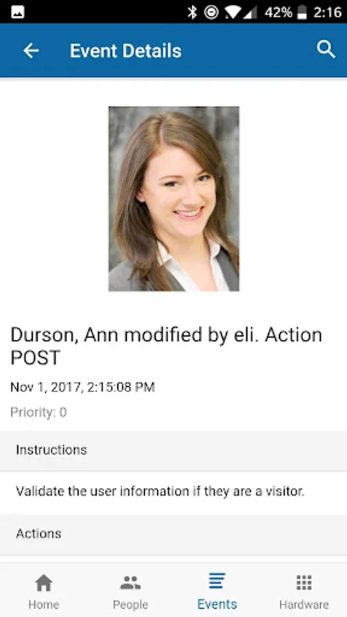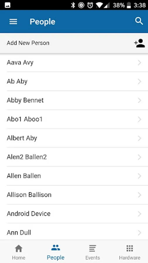 You can view the list of people in your instance or search for a specific person by name. You can easily view and edit a person's contact information, badge type, access levels and assigned cards. You can also add new people into your instance and upload their image or take a picture of them using your device camera.
