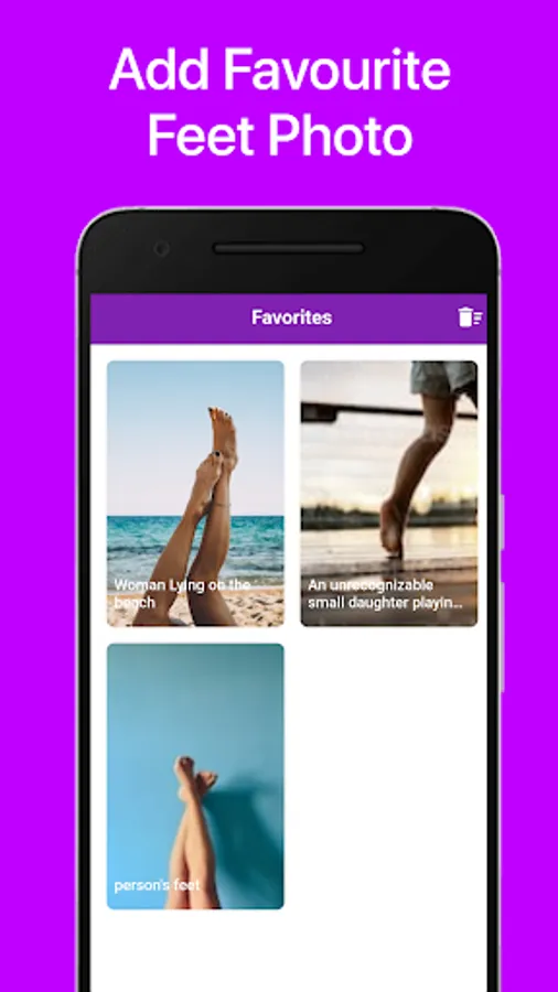 Feet Photos is an application that allows you to collect photos of your feet photos, find your favourite feet and useful ways to take care of your feet in the best way.