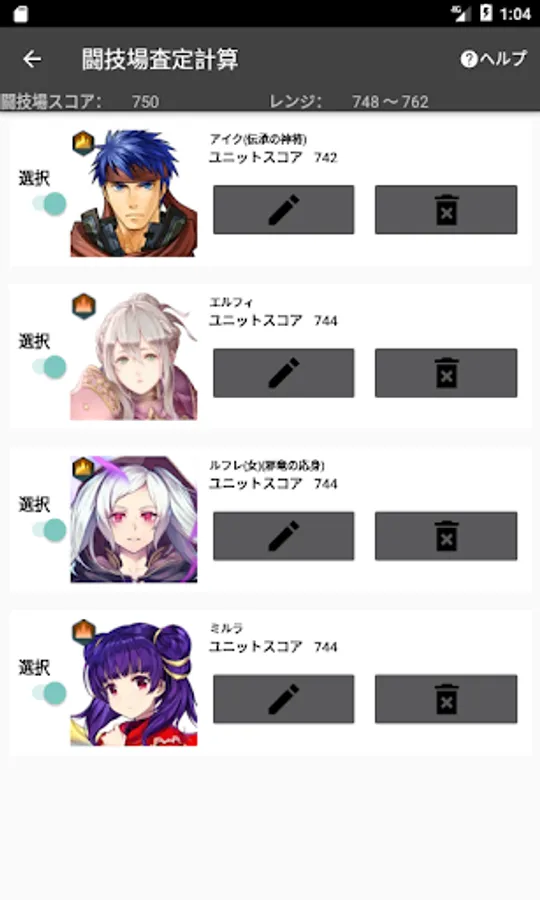 また、キャラクターとスキルを登録し、闘技場の査定の目安を計算できます。
