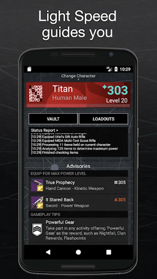 Light speed is the perfect companion app when playing Destiny 2. Let it keep track of the best way to play Destiny 2, no need for your to keep checking the latest internet guides, and no more trips to the Tower to use the Vault.