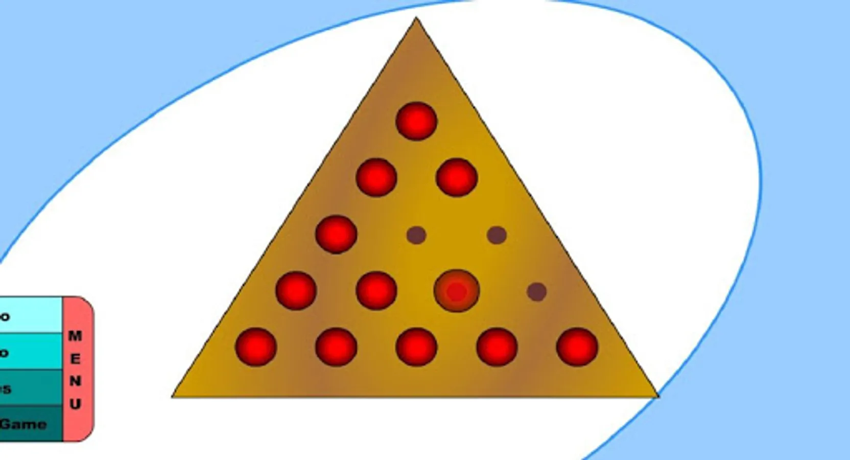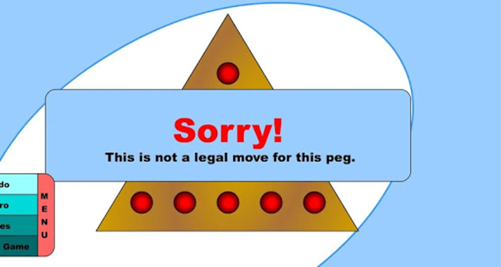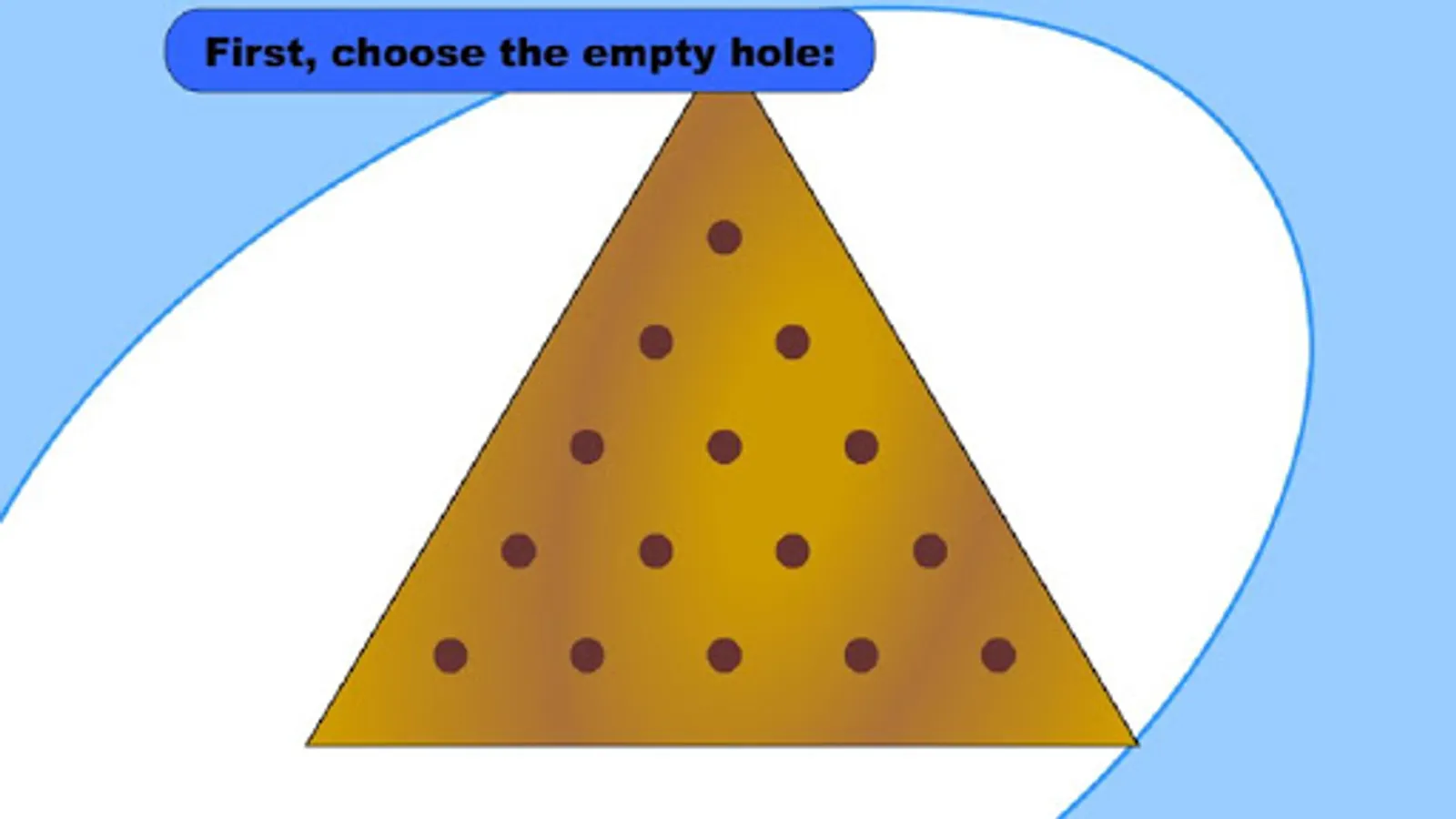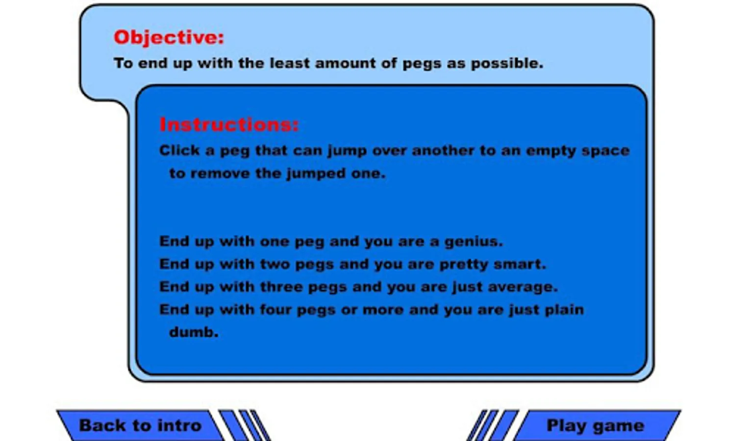 Instructions: Click a peg that can jump over another to an empty space to remove the jumped one. End up with one peg and you are a genius. End up with two pegs and you are pretty smart. End up with three pegs and you are just average. End up with four pegs or more and you are just plain dumb.