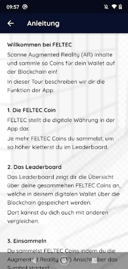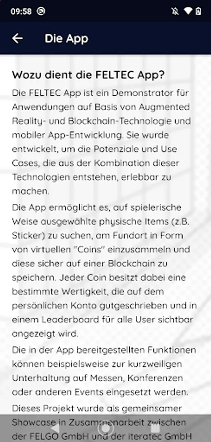 The FELtec App is a demonstrator for applications based on augmented reality and blockchain technology and mobile app development. It was developed to make it possible to experience the potential and use cases that arise from the combination of these technologies.