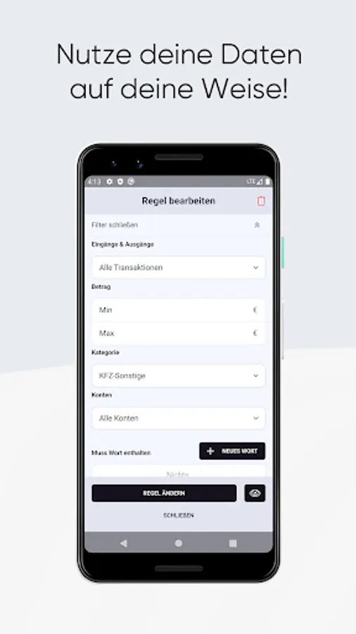 Don't waste time on time-consuming expense tracking and manually entering your running costs and income. Personalize your evaluations with your own rules and automatically categorize your transactions.