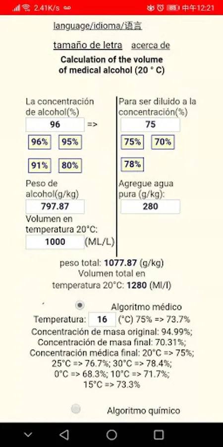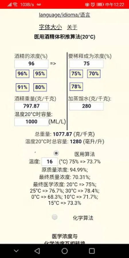 Used to calculate the alcohol concentration for dilution, you can enter alcohol to calculate water or enter water to calculate alcohol.