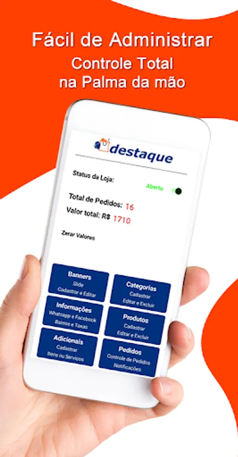 To make your control even easier, we provide the Featured Light Panel, which is a second Application, being able to register Categories, Products, Neighborhoods, Banners, Notify the progress of orders to your customers and much more!