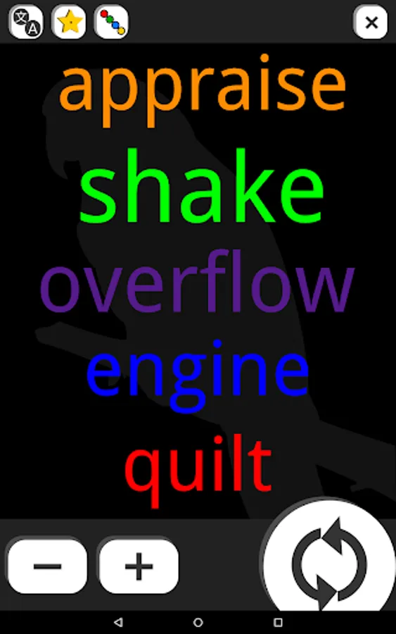 Parrot is a minimalist random word generator designed to be used in brainstorming sessions. You can choose the number of words generated, which will be remembered between sessions in case your brainstorming technique focus on a specific number. The words available are chosen to have lots of associations to keep the creative juices flowing. English, Spanish, French, Portuguese, German, Italian, Russian, Japanese, Chinese and Hindi are supported. You can also open a .txt file with your own list of words (the words should be comma or space separated). And in case you want to use those words somewhere you can copy them with a long press. People have used this app for improving their rapping improvisation skills, generating ideas for new art projects, getting out of writer's block and more, what are you going to do?