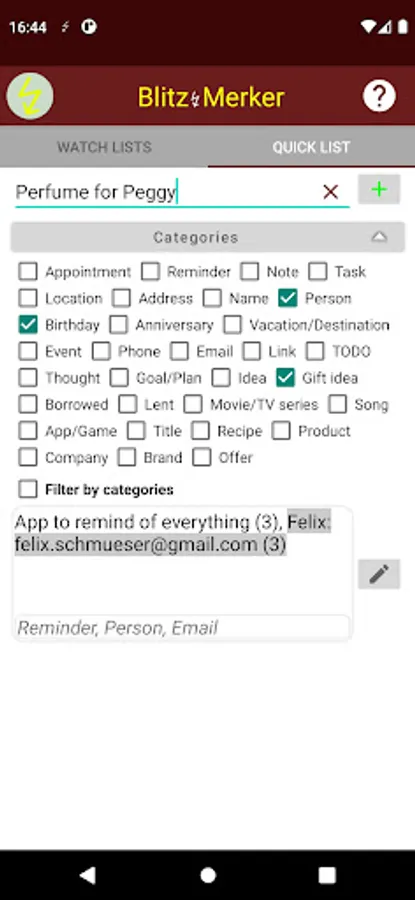 Additionally, the quick-list feature allows you to record spontaneous ideas, thoughts, appointments, etc. quickly and categorized.