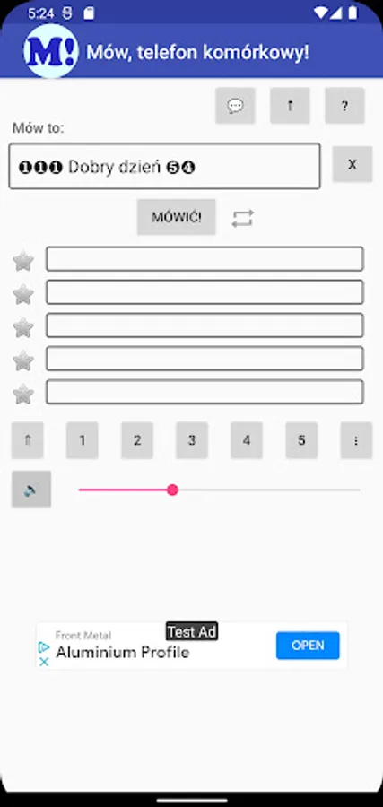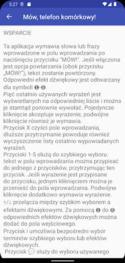 The app uses Android's text-to-speech feature to output the spoken text you entered - with added sound effects. The last five terms are stored in the list, and you can assign up to five terms to the shortcut keys.