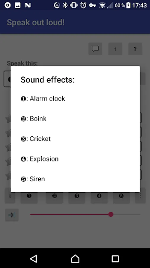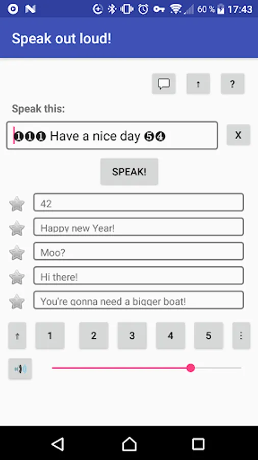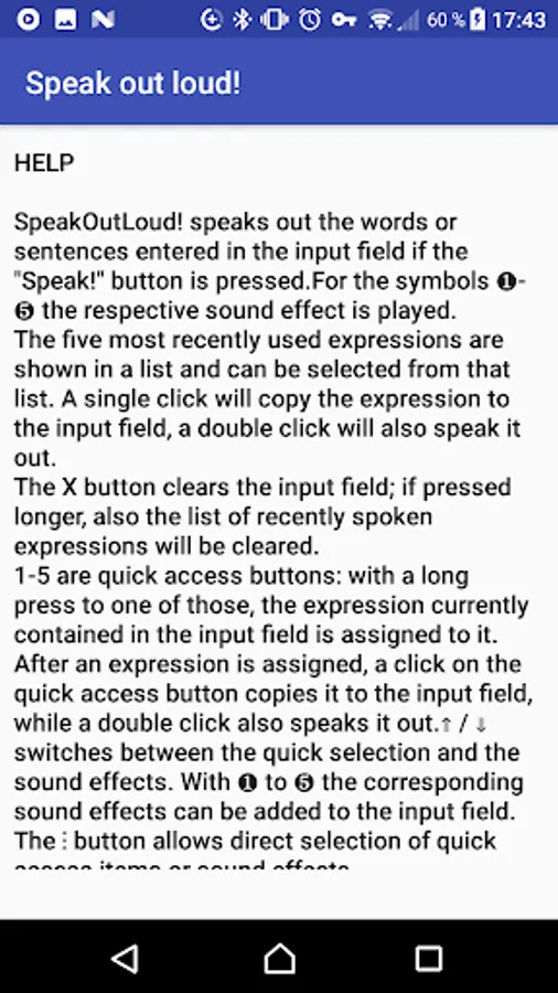 Speak Out Loud! uses the Android text-to-speech engine to speak out any word or sentence you choose to enter to it (in English)- with sound effects added optionally. The five most recently used expressions are stored in a list, and up to five expressions can be assigned to quick access buttons.