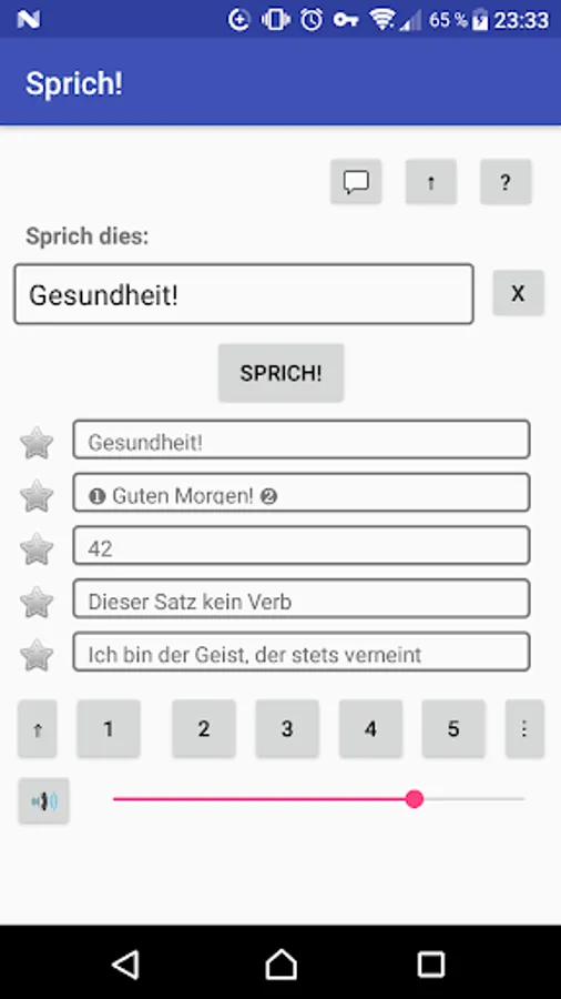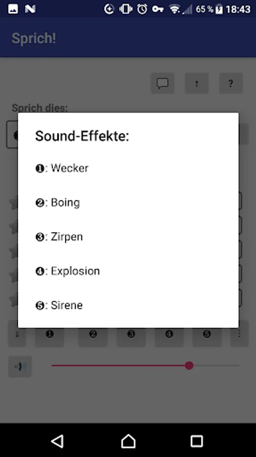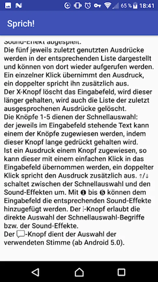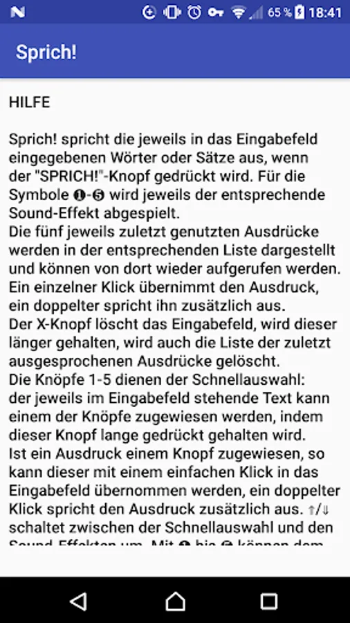 speak! uses the Android text-to-speech feature to output an entered text spoken (in German) - with addable sound effects. The last five terms are kept in a list, and up to five terms can be assigned to shortcut keys.
