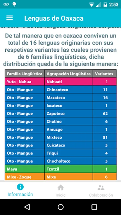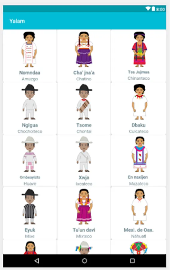 Jalam contains 16 languages Oaxaca. Amuzgo, Cuicateco, Chatino, Chocholteco, Chontal, Chinanteco, Huave, Ixcateco, Mazatec, Mixtec, Mixe, Nahuatl, Triqui, Tsotsil, Zapotec, Zoque.