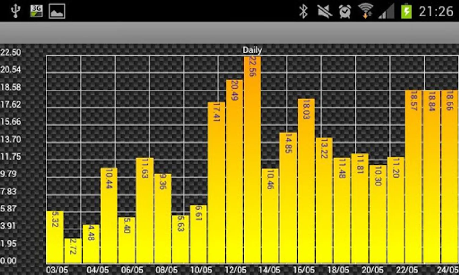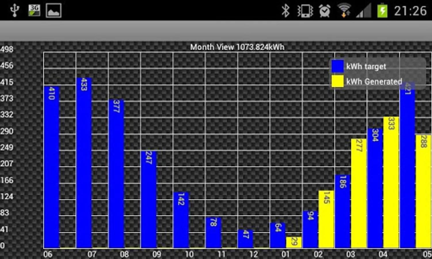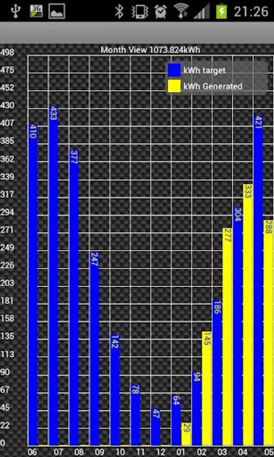 Historical daily totals (kWh) data viewing by scrollable bar chart.