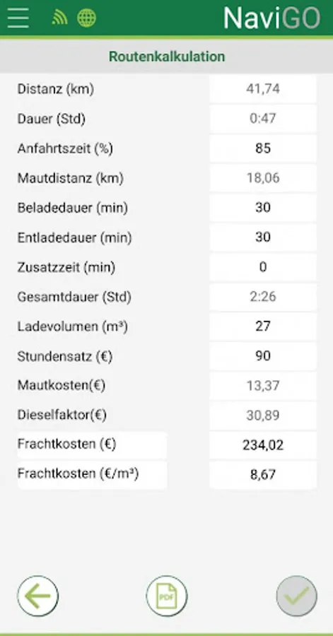 Exact route calculation with exact freight costs, tolls, fuel, vignettes, transport times and kilometers. Routes can be easily displayed on the map in NaviGO. Information about the generated route with driving time, toll, loading volume, hourly rate, diesel factor, loading and unloading time can be called up at any time and can be evaluated.