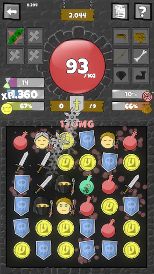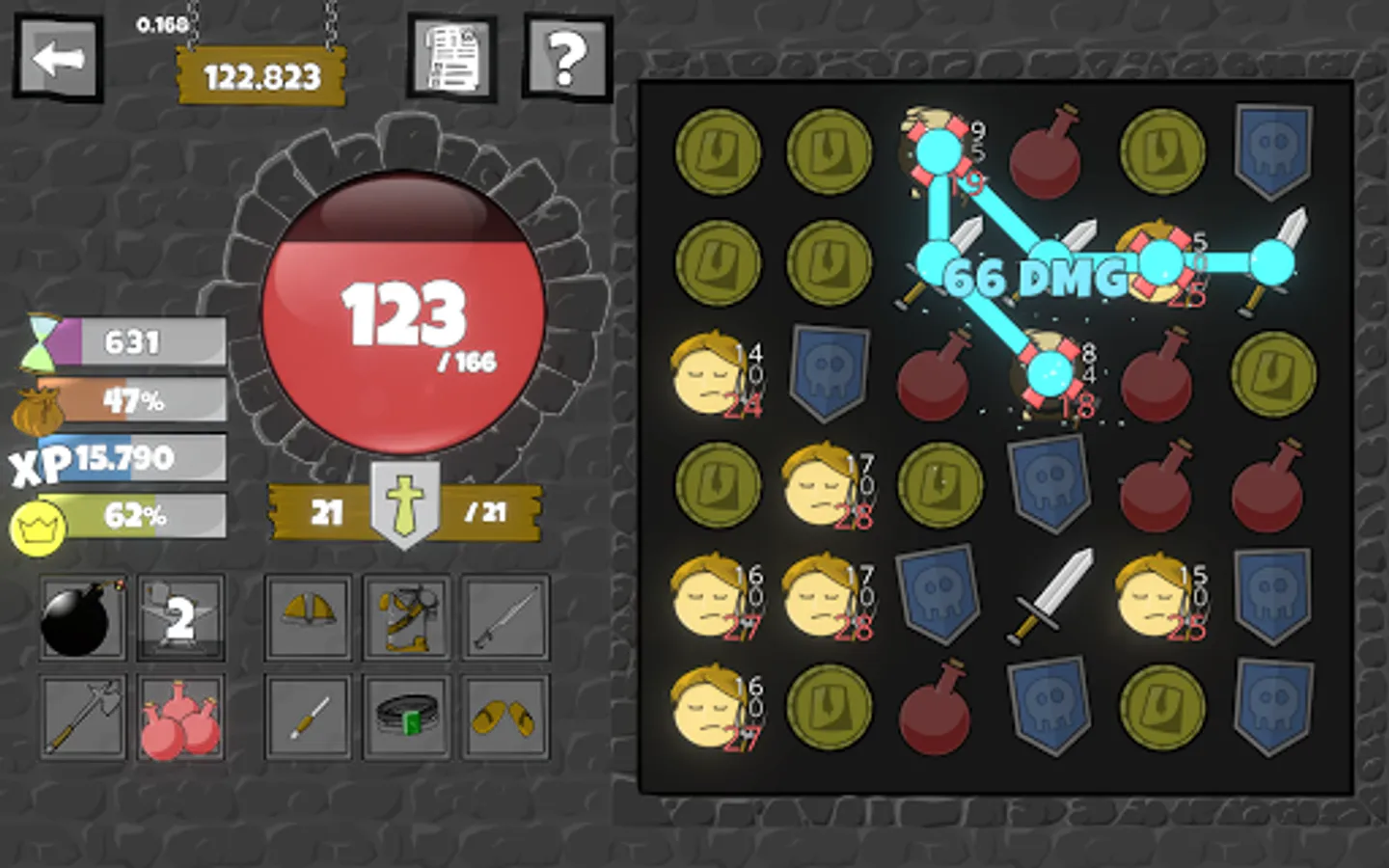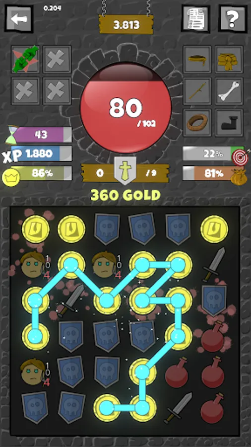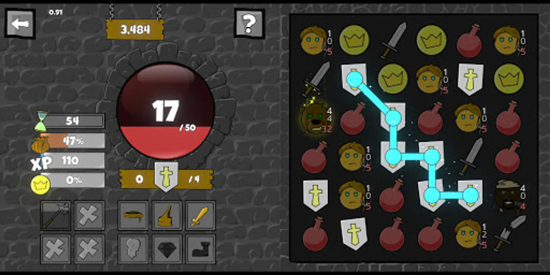 More and more enemies pour through the broken door and by connecting them to sword tiles you can fight them off. Once you get hit you can connect potions to heal your wounds or connect shields to improve your armor. Connecting gold might lead to new treasures that help you defend what is yours and keep their filthy hands of your stuff.