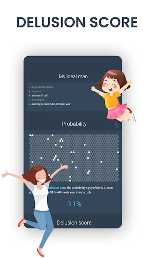 The Female Delusion Calculator, a revolutionary app designed to help women navigate the world of romance and discover their chances of finding the man of their dreams. Are you tired of endless dating trials and wondering if your perfect match exists? With the Female Delusion Calculator and male delusion calculator you can uncover valuable insights based on real-time US survey data and gain a better understanding of your prospects in the quest for love.