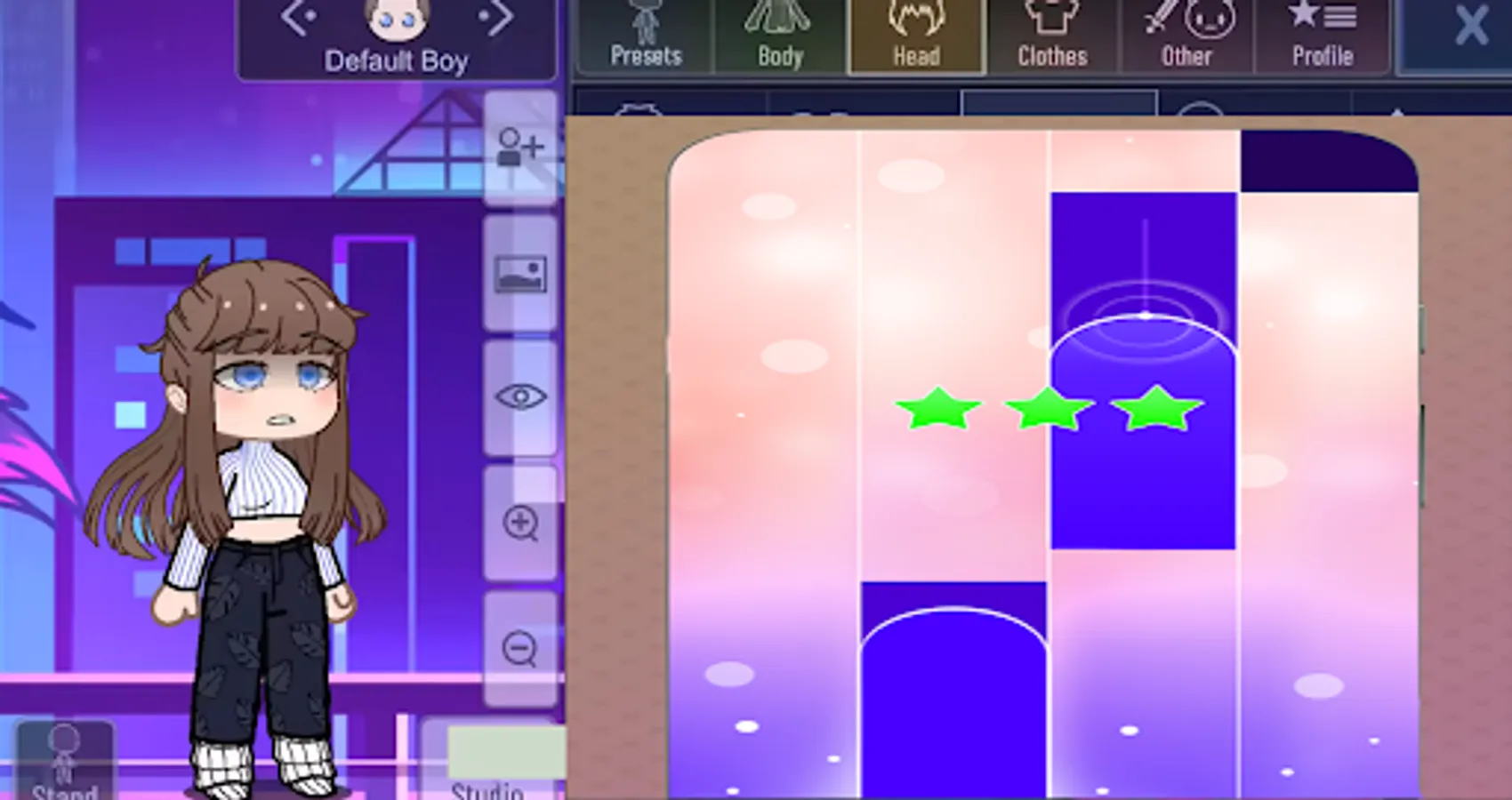 In the gacha plus, you can Piano your characters to life by placing them in custom scenes, adding imoji, objects, and backgrounds to create your own world. Also with the ability to set custom profiles and import and export characters, the possibilities are endless!
