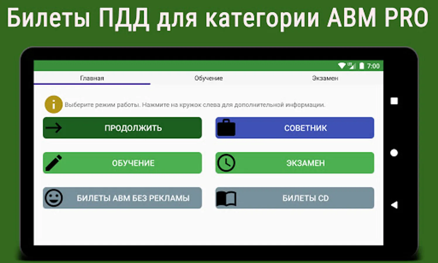 If you do not have enough time to prepare well for the exams in the traffic police, then this application will help you. New tickets for ABM categories (A, B, M, A1, B1). Accelerated preparation for exams in the traffic police. The application has an innovative training mode "Advisor", which instantly selects the most problematic ticket. It starts with one touch on the main page of the application.