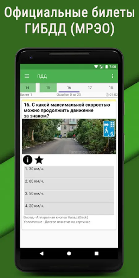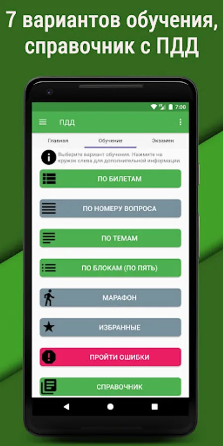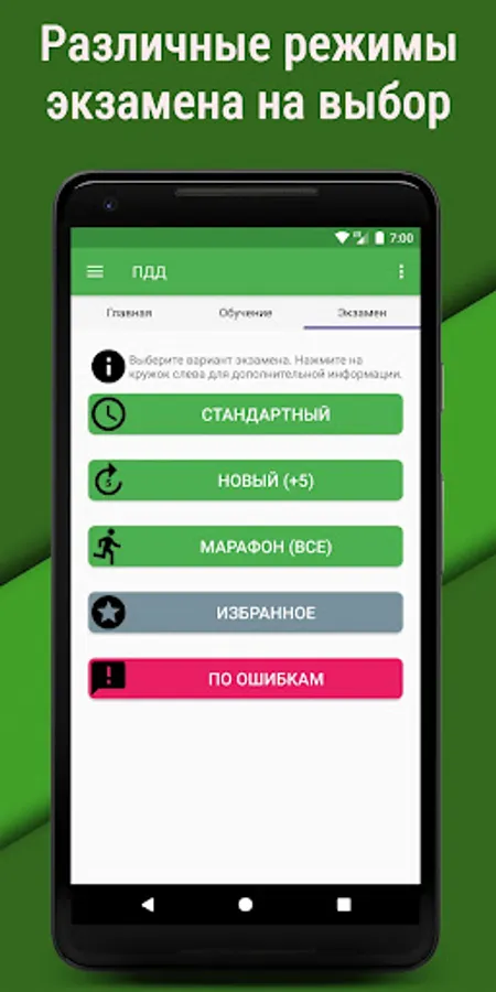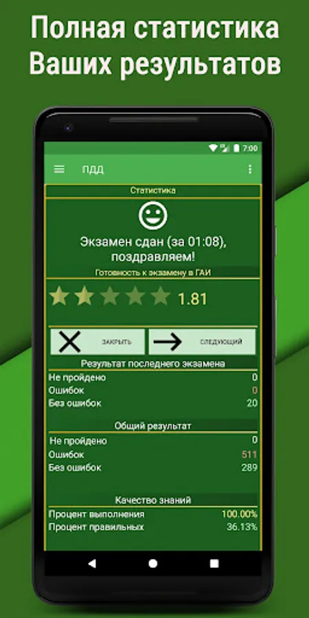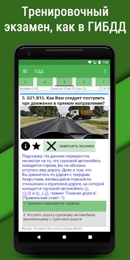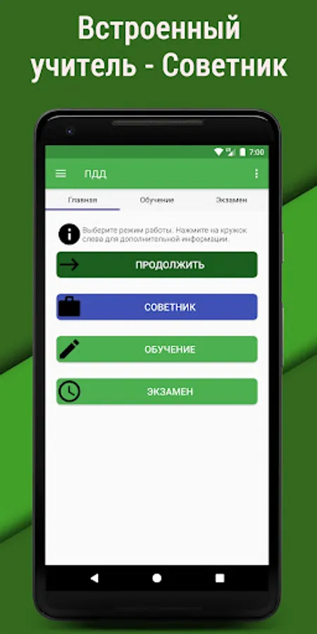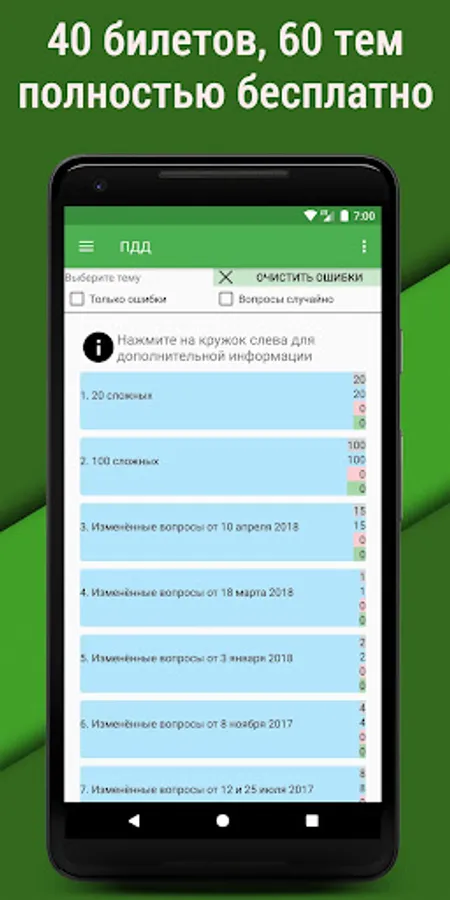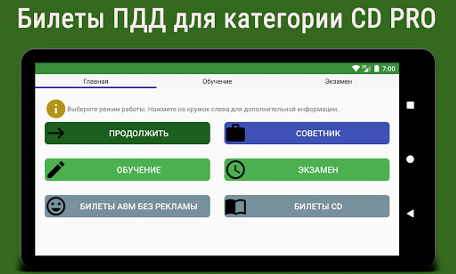If you don't have free time to prepare for your CD exam, then this application will help you. The application has an innovative training mode "Advisor", which instantly selects the most problematic ticket. It starts with one touch on the main page of the application.