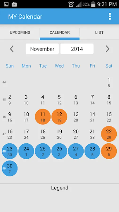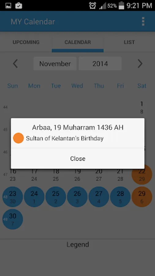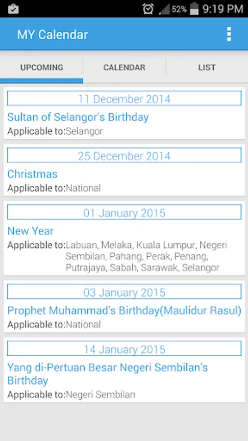 - Create Calendar's event for holidays (click on each holiday item under "UPCOMING" and "LIST" tabs)