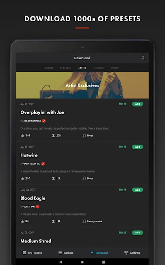 • Search, browse and download over 10,000+ presets from the Tone™ community.