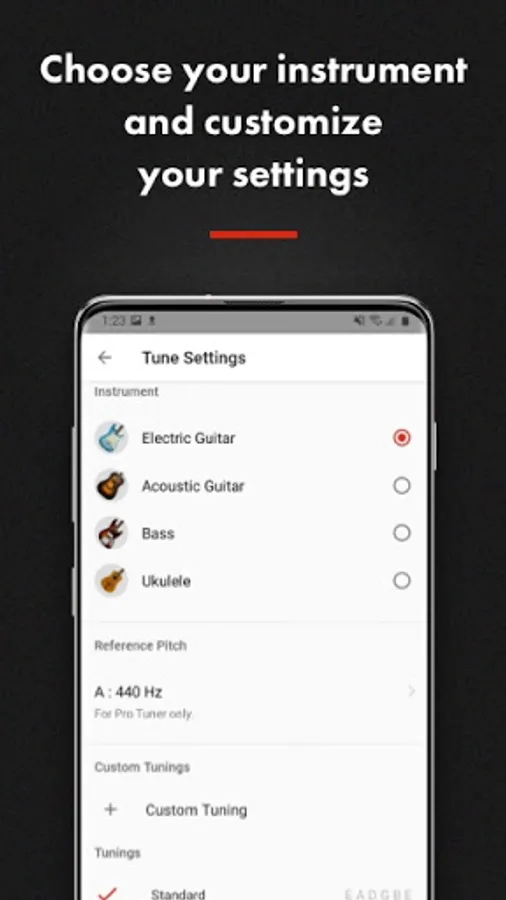 Auto-Tune Mode - Pluck a string and the tuner listens to the note to guide you to a perfect pitch. A string-by-string diagram guides the selected tuning.