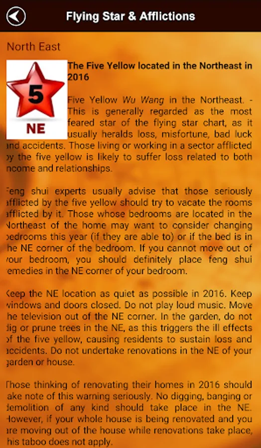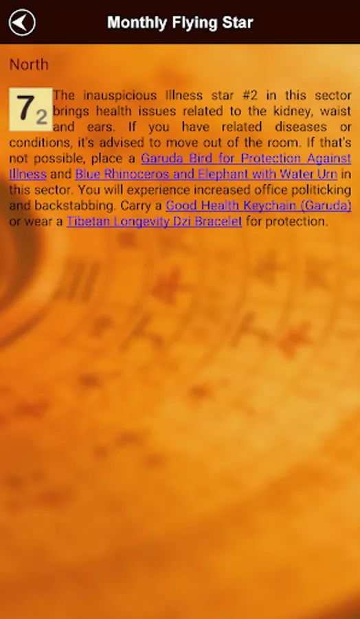 Under the annual and monthly Flying Star and Afflictions charts, you can lock the map according to your home or office’s facing direction. Then, simply superimpose the charts to the layout of your premises. From there, you can see which sector of your home or office is afflicted by unlucky stars and find out the cures for them. At the same time, you can tap into the energies of the areas blessed with positive winds to benefit from them. These methods produce impressive and quick results and can both shorten periods of bad luck, while activating or prolonging periods of good fortune.